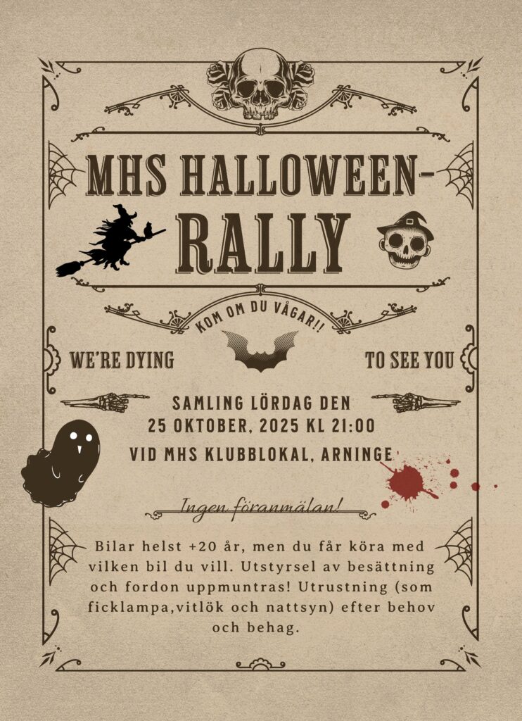 Categories: Halloweenrally, Kommande evenemangAv MHSAdminoktober 5, 2025Project navigationPreviousPrevious project:250927 MHS Bakluckeloppis